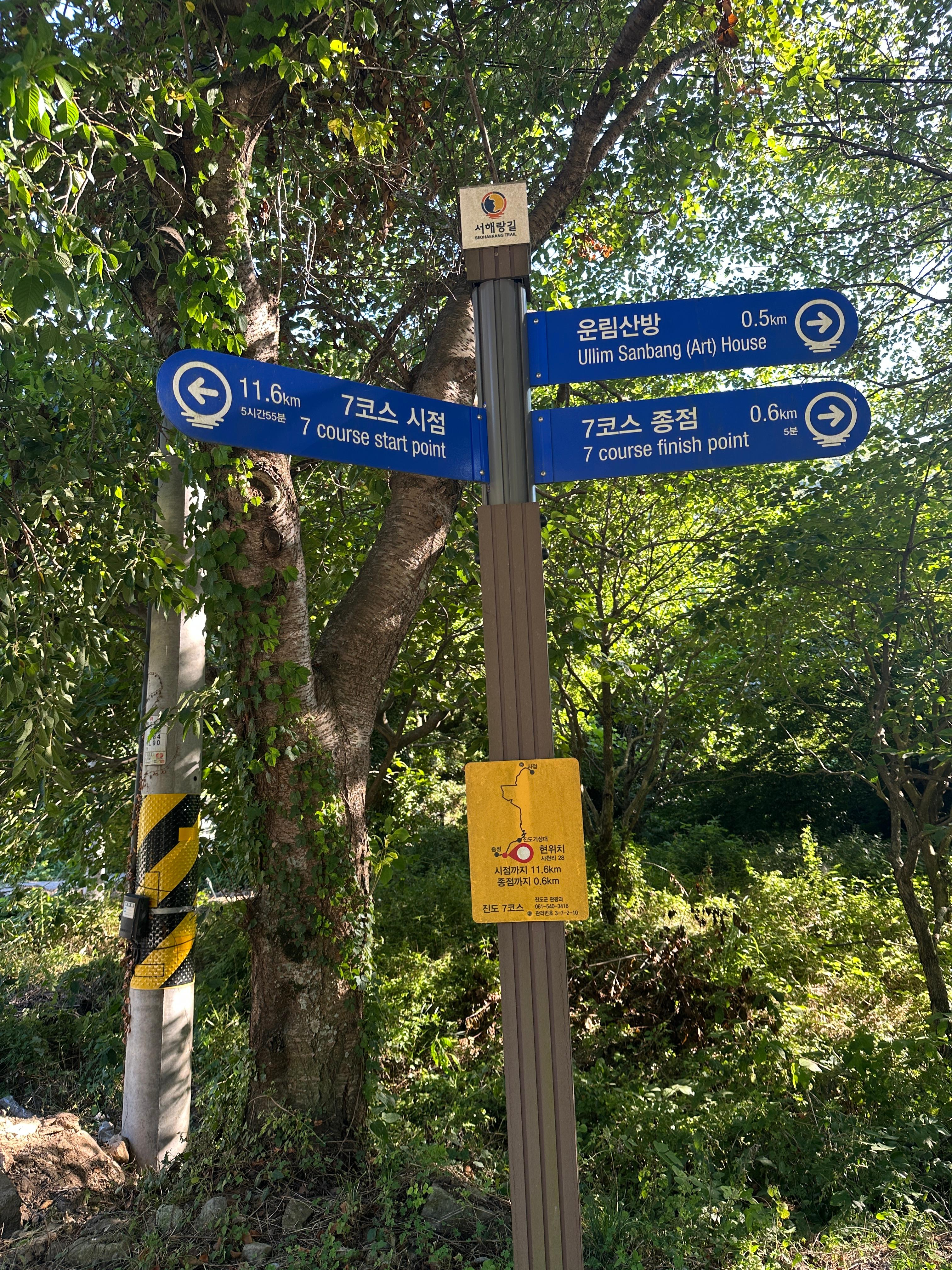 첨찰산 정상석은 봉수대를 내려와 기상청 방향으로 내려가는 길에 서 있다. 봉화골로 내려가는데 서해랑길 7코스 이정표가 서 있다. 여기서부터 운방산방 주차장까지는 서해랑길 7코스와 겹치는 구간이다.