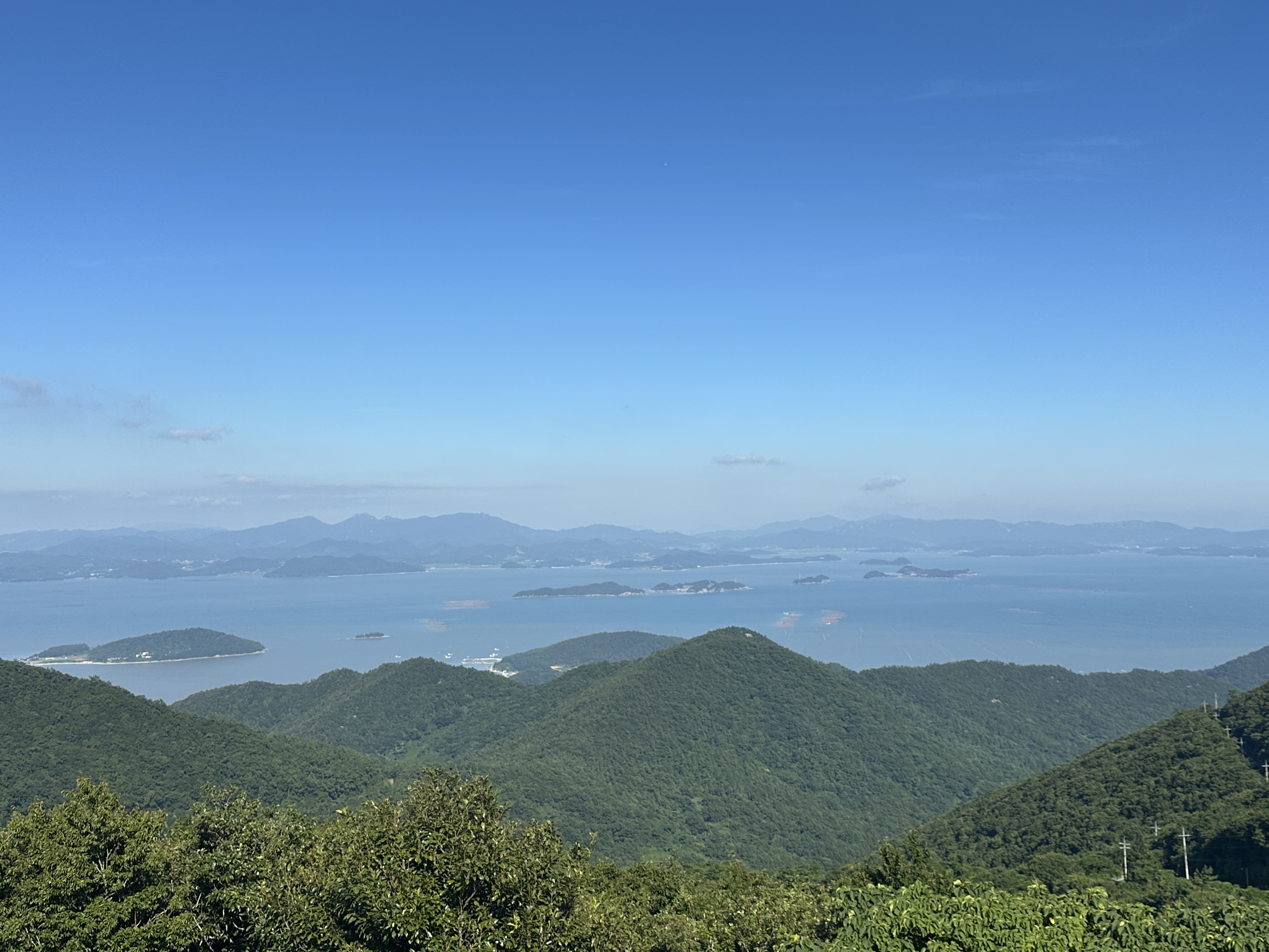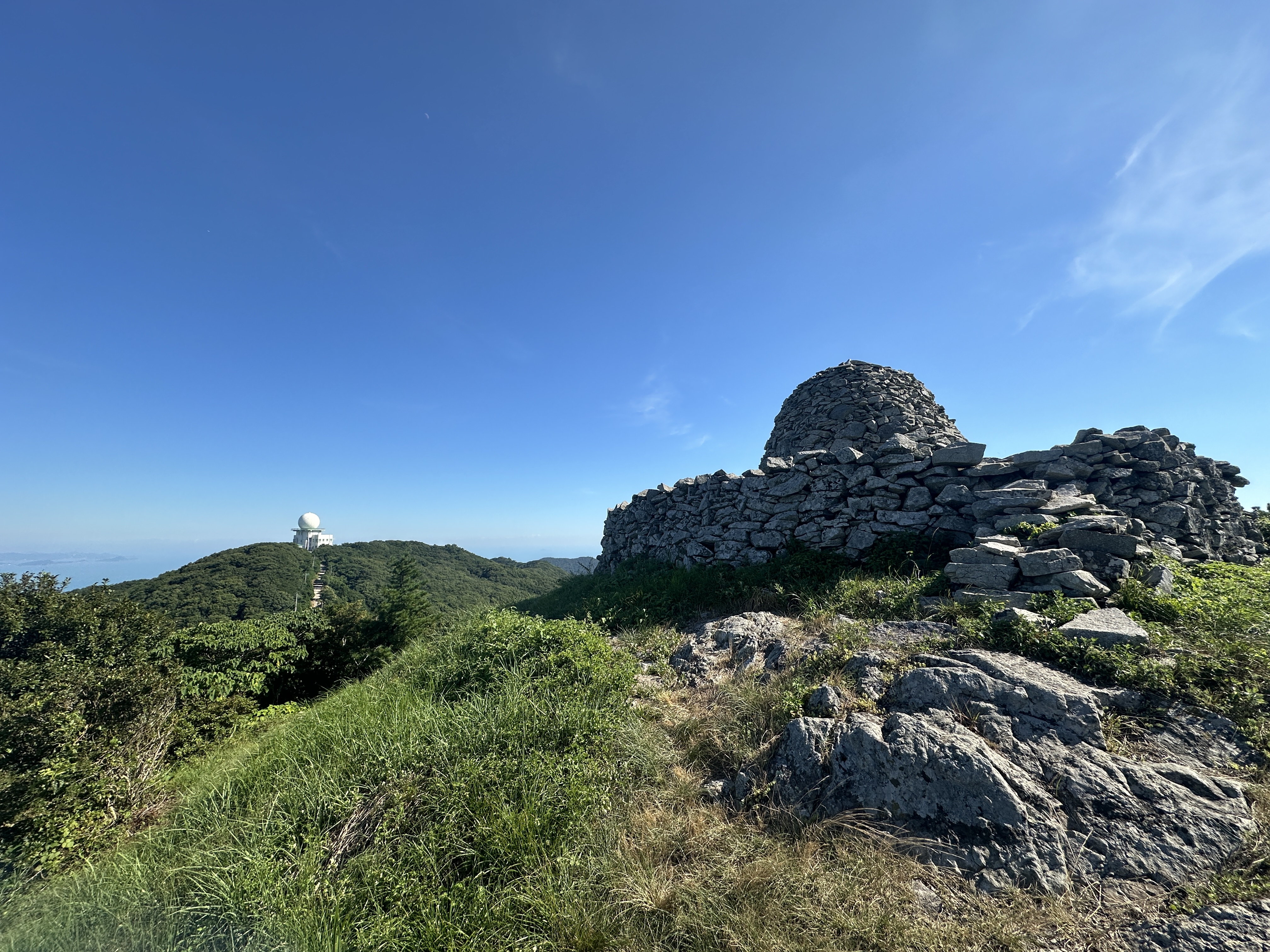 석간수를 지나 정상으로 올라가는 갈림길 이정표가 있는 곳에 넓적바위라고 안내가 되어 있는데 어디에 넓적바위가 있는지 모르겠다. 우리는 경사가 덜 심한 왼쪽길로 올라갔다. 올라가다보니 왼쪽에 차가 다니는 임도길이 있다. 정상에 도착하니 날이 좋은데도 미세먼지로 인해 시야는 그리 좋지 않다. 봉수대로 올라가 그늘이 생겨 시원한 쪽 바위에 걸터 앉아 바다에 떠 있는 섬 풍경을 보며 잠시 한가롭게 쉬었다.