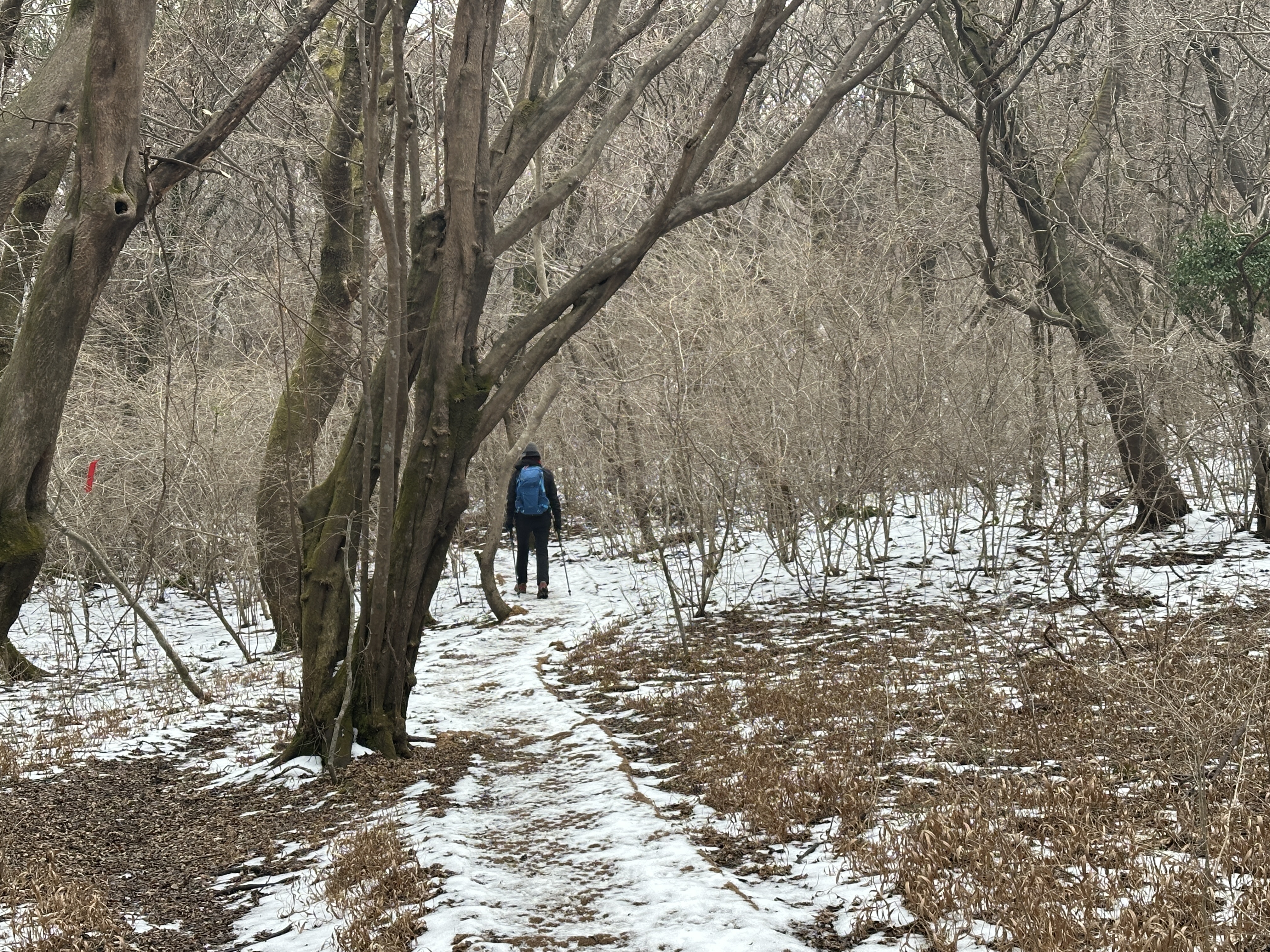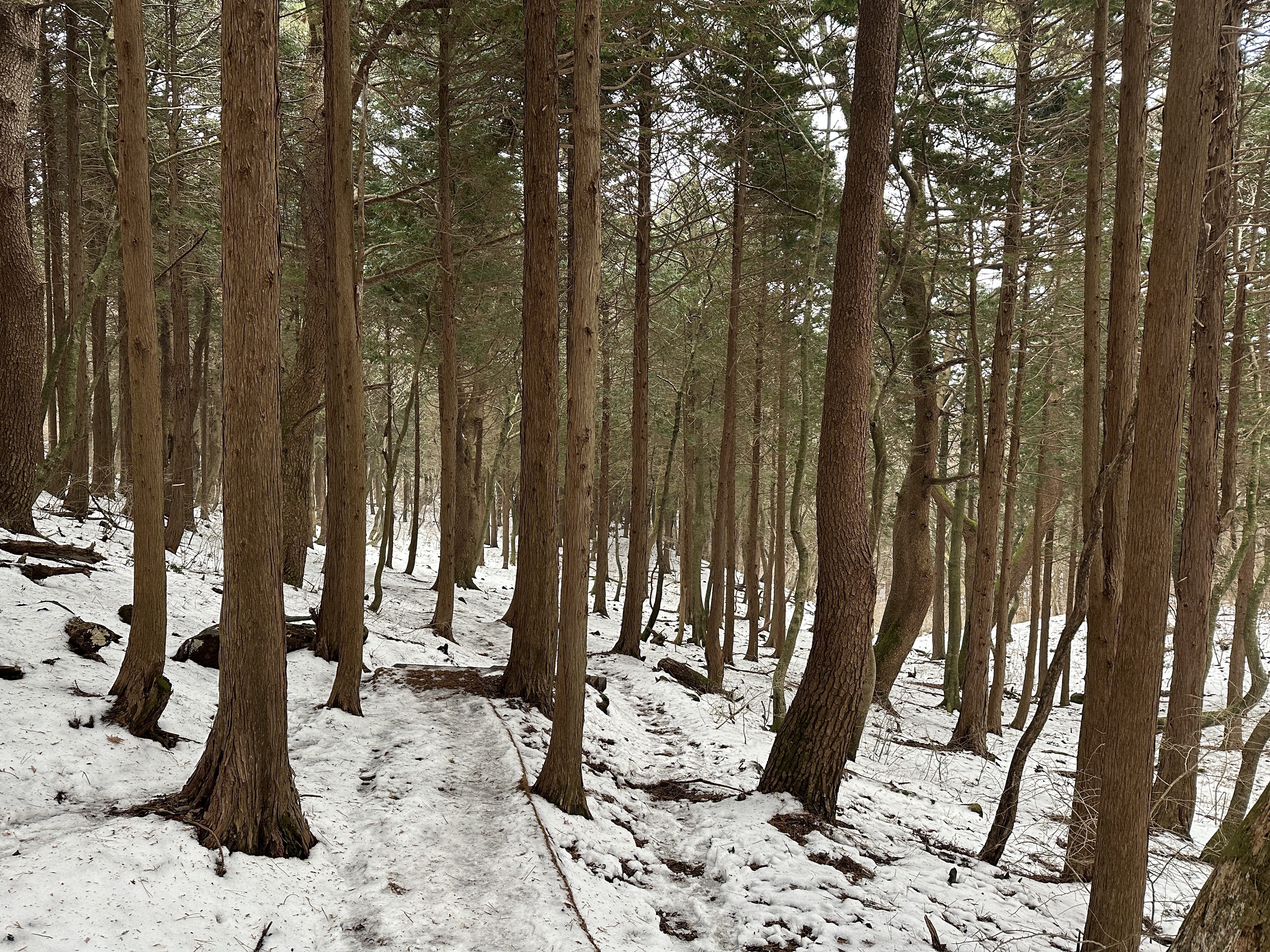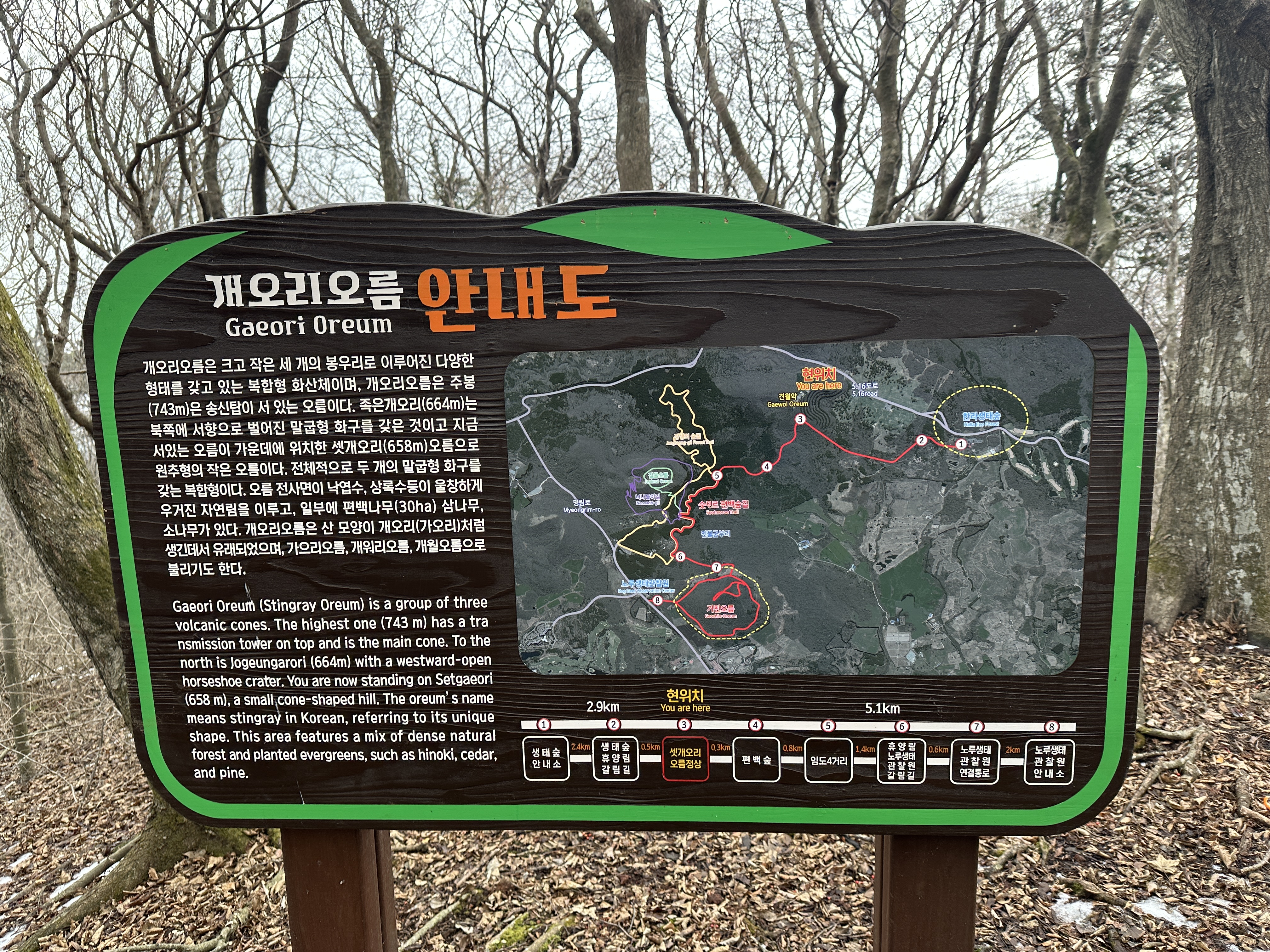 생태숲 안내소를 지나 숲길로 들어갔는데 길이 점점 미끄러워 조심해서 걸었다. 편백숲으로 갈림길에서 조금 편안한 길이 있지만 오늘은 섯개 오름으로 올라가는 계단길로 가기로 했다. 섯개 오름에서 편백 숲길로 내려갈 때는 아이젠을 하고 걸었다.