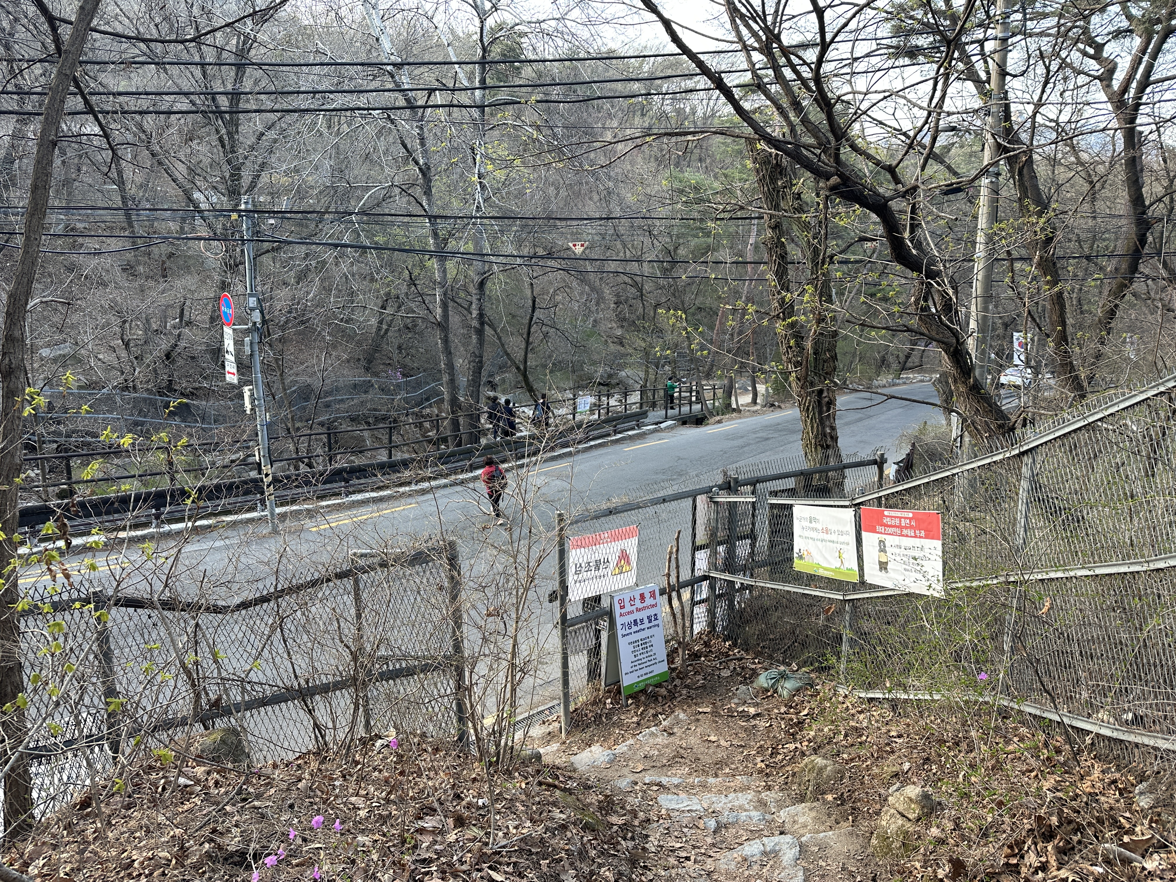 하산길로는 백련사 방향으로 내려가는 길이 빠르기는 하지만 경사가 심해 완만한 진달래 능선길로 하산하기로 했다. 능선을 따라 끝까지 걷다 마지막에 10분 정도 가파른 계단길을 내려오니 우리가 소귀천 계곡을 향해 올라가던 길과 만난다. 여기서 10분 정도 걸어내려가면 북한산 우이역이다.